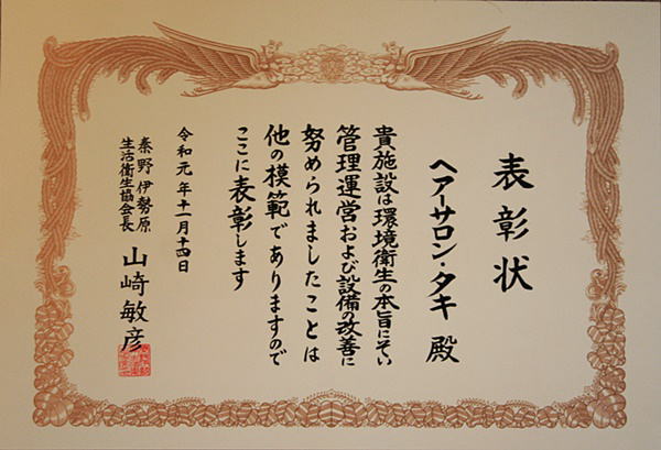 生活衛生優良施設として表彰されました(^-^)!! この度、当店が生活衛生優良施設として表彰されました(^-^)!! 当店では、少しでもご来店頂くお客様に、ゆったりくつろいで 頂く環境作りと共に技術向上に努めて参りました(^ー゜)!!