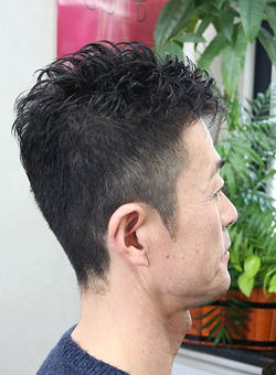 仕事柄ショート・楽々セット希望の40代のパパ・パ-マヘアーです!!根本の立ち上がりを 出し、柔らかいカールをかけ、更にサイドから見てお分かりのように、かなり軽さを出すことで ショートでも柔らかさと華やかさのある、軽・ふわぁーショートヘアースタイルになります。爽やかスタイルとして、職種・年代を問わず楽しんで頂けるお薦めセット楽々ヘアーです。 |
